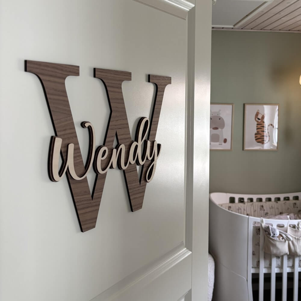Tag et kig på vores smukke navneskilt til børneværelset. Det har et stilrent design, med det mørke og lyse træ sammen, og passer helt perfekt ind i de fleste hjem.
