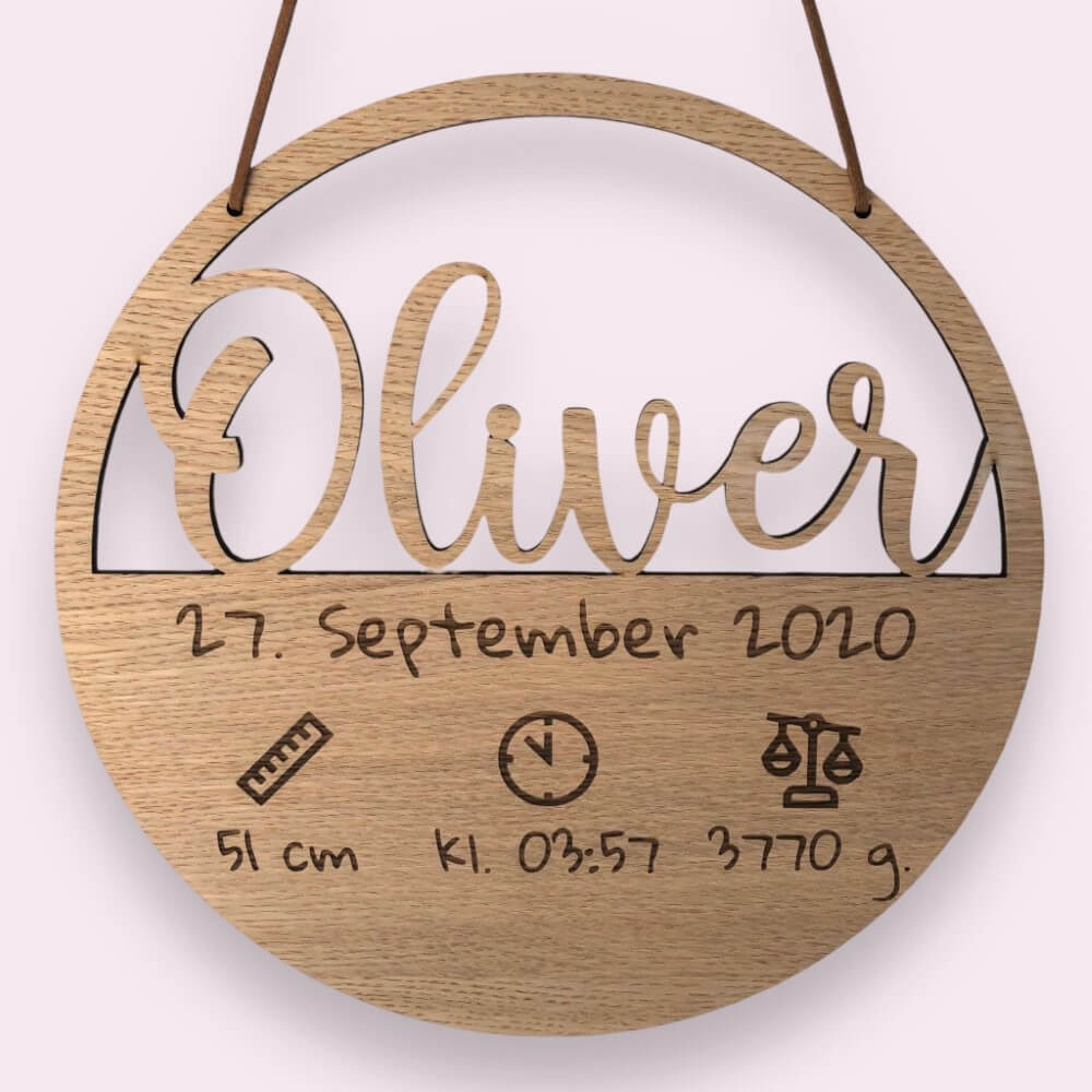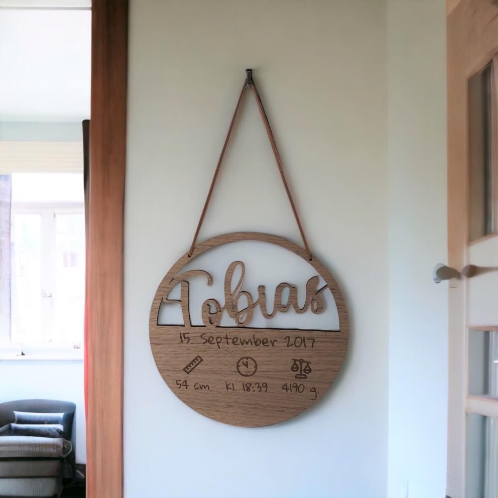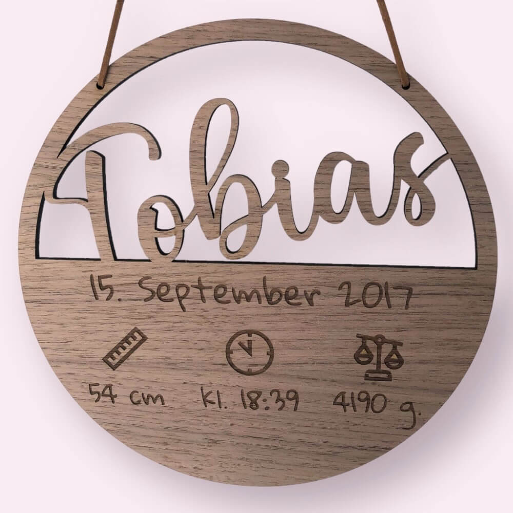 Fødselstavlen kan vælges i enten lyst egetræ eller den lidt mørkere valnød. Da produktet bliver lavet på bestilling, kan det variere hvordan navnet er placeret i halvcirklen. Kommer an på længden af navnet.