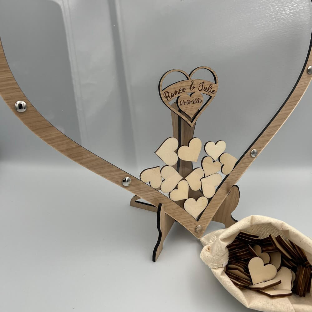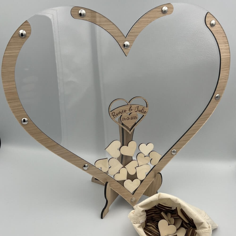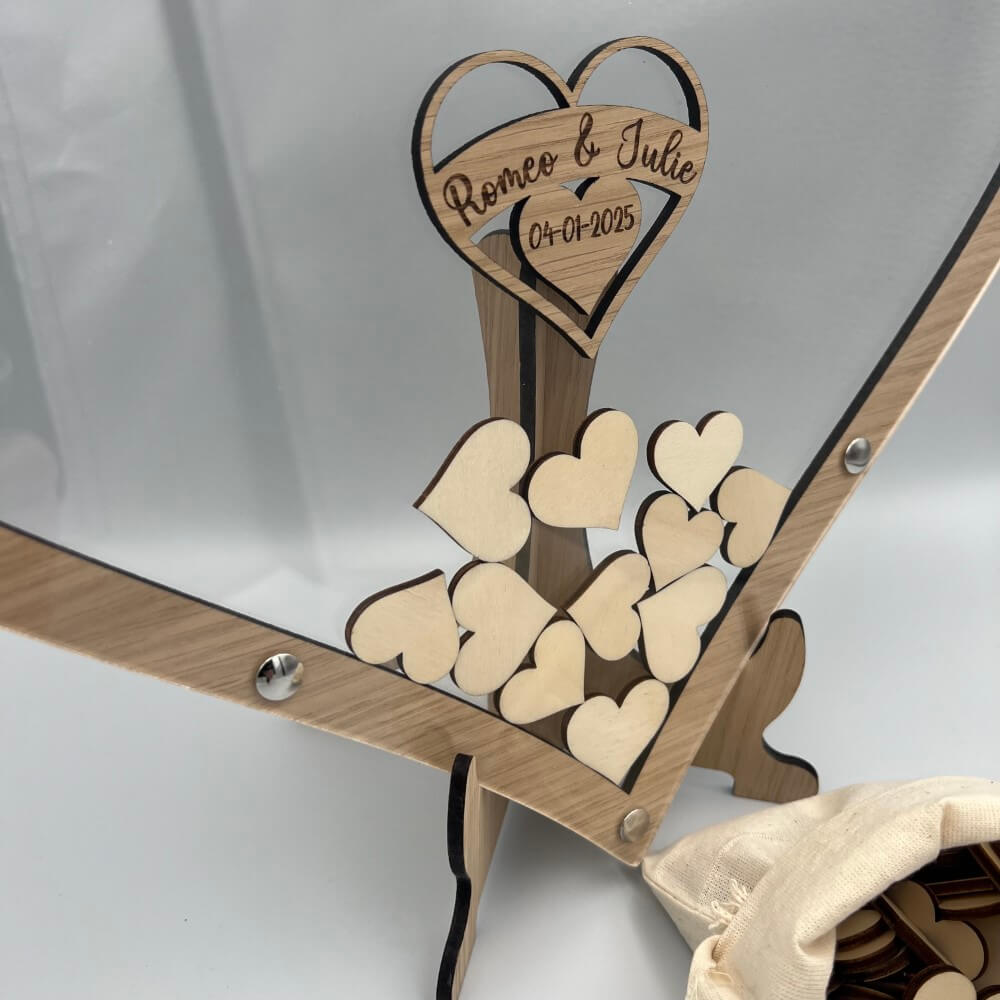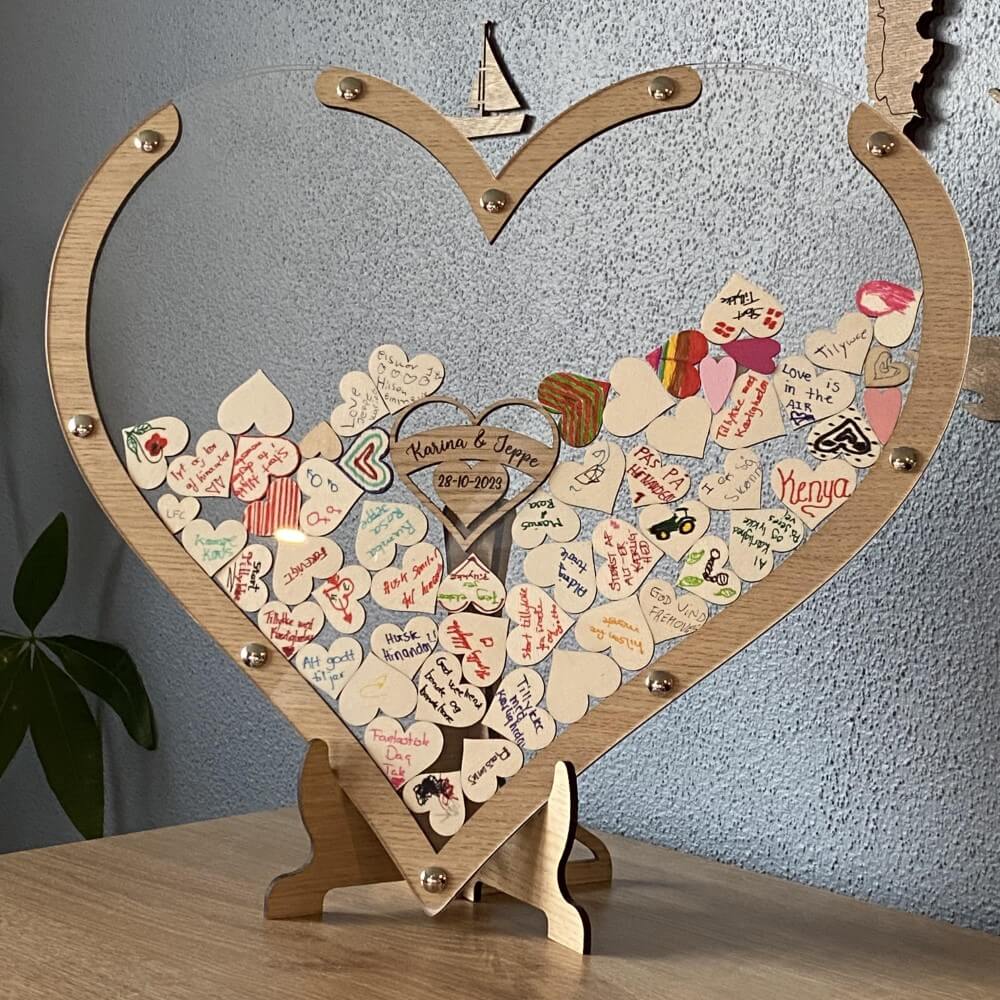 Gæstebogen består af en for og bagside af klar akryl, og ege, alle valnød træ imellem. De små signerede hjerter kan således puttes ned i den store hjerte ramme.