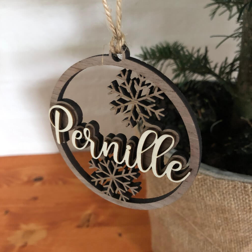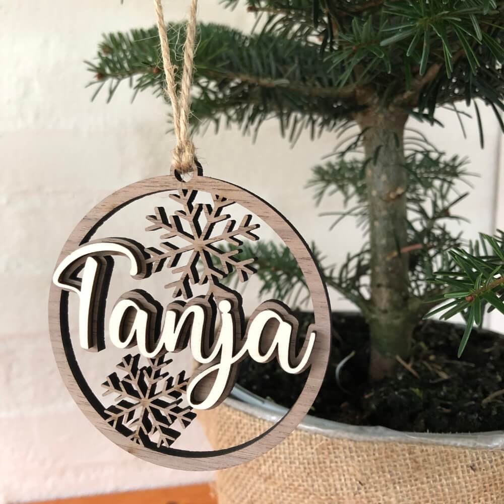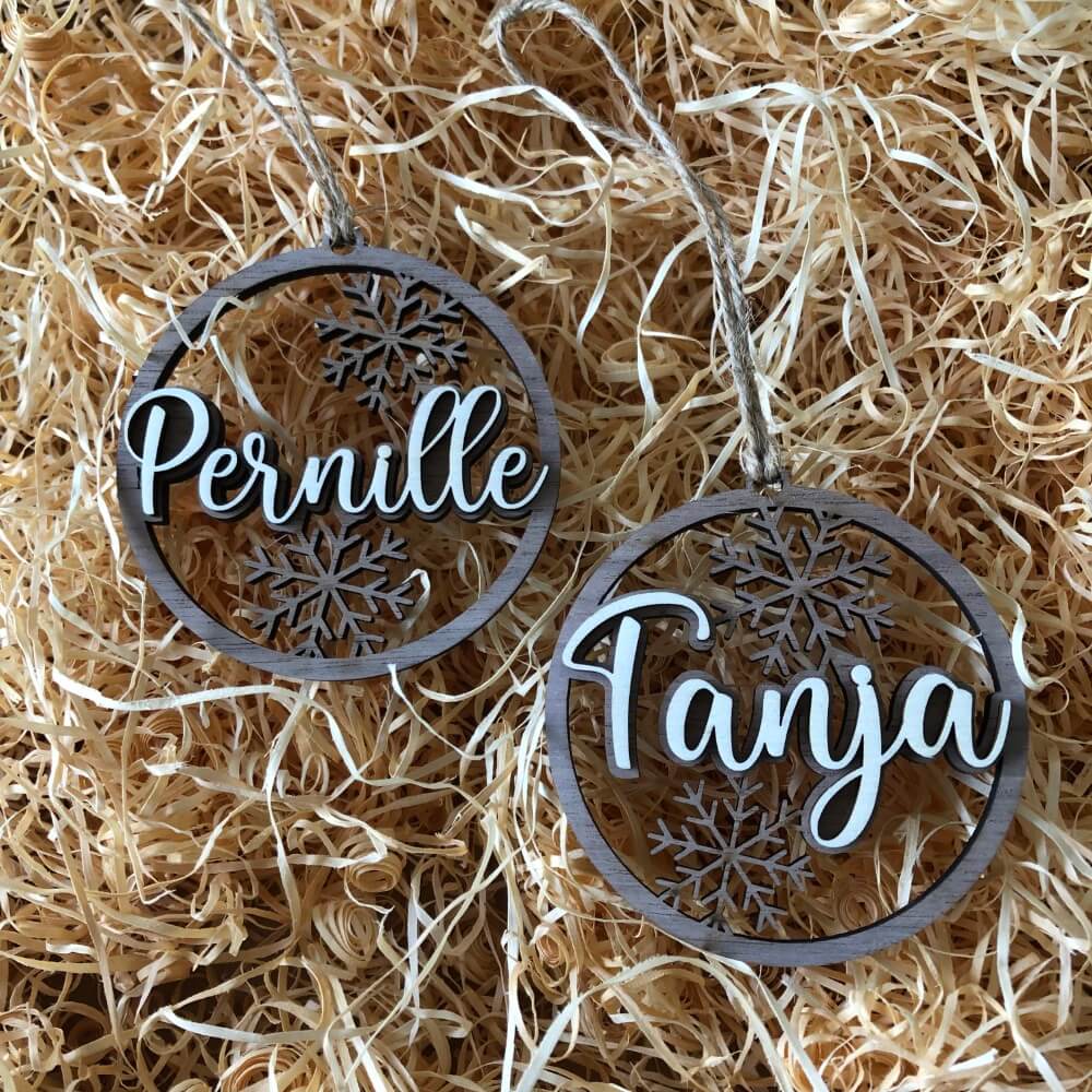 Få hele familiens navne på juletræet med disse smukke julekugler. De er fremstillet i to lag, hvilket giver en god 3D effekt af navnet. Virkelig flotte med sammensætning af det mørke og lyse træ.