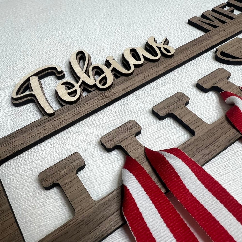 Fremvis dine medaljer med stil med en personlig medaljeholder i den mørke valnød, designet med dit navn udskåret i lyst birketræ. En eksklusiv og dekorativ medaljeholder, der kombinerer naturlige materialer med et personligt udtryk.
