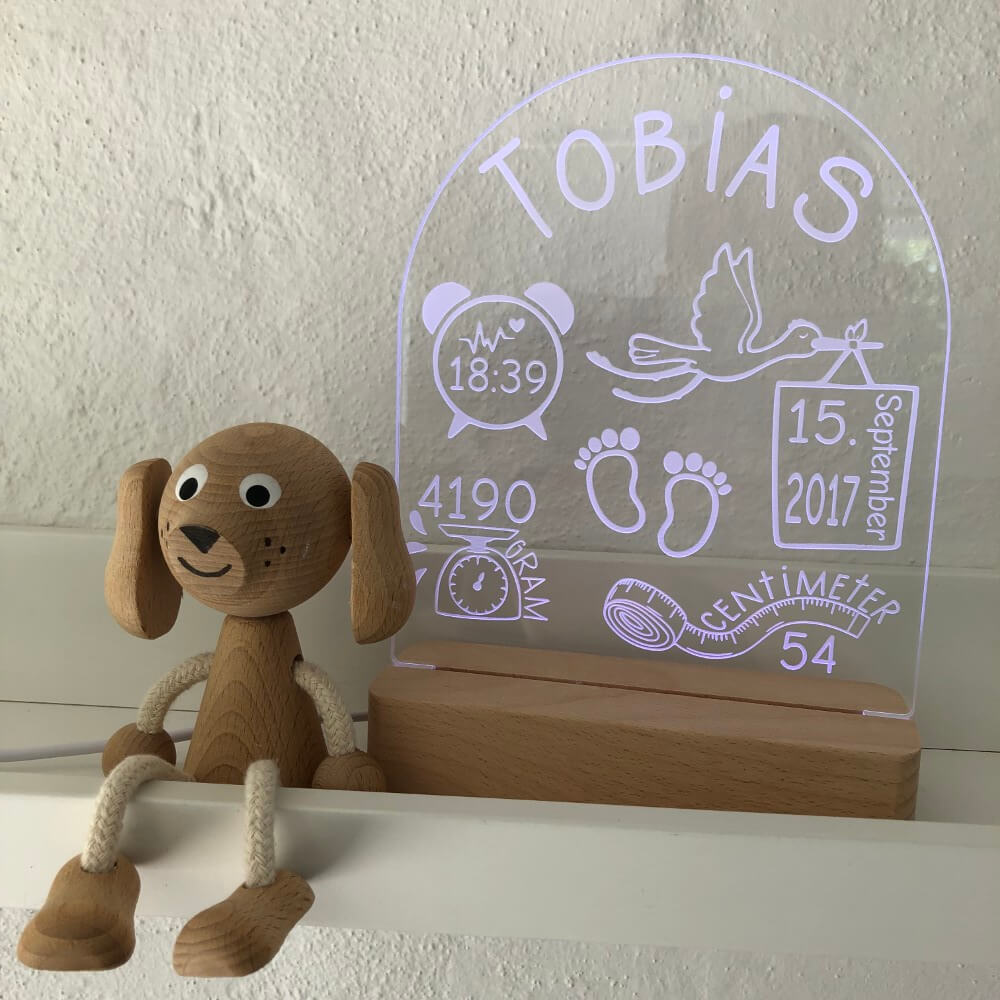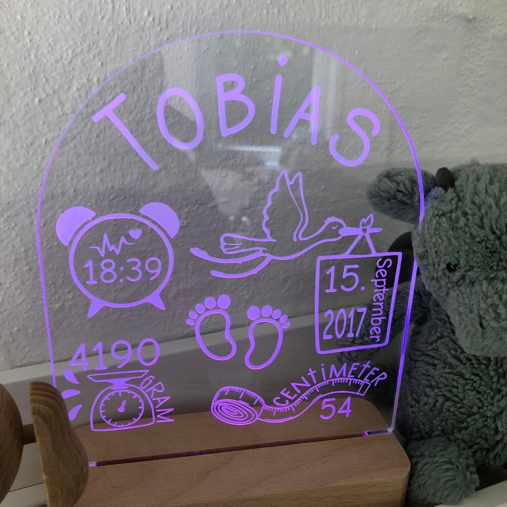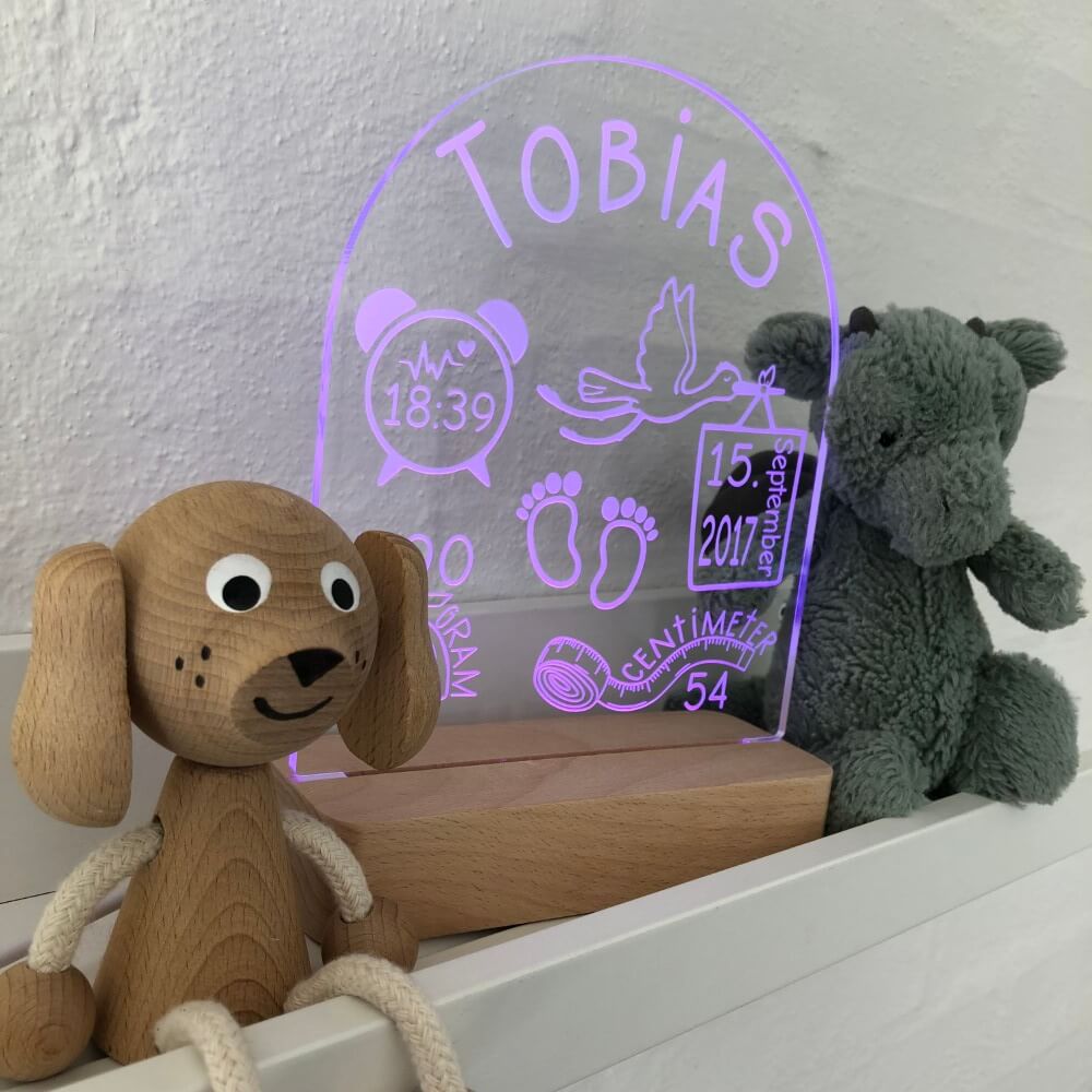 Personlig natlampe og fødselstavle i et. Giver et behageligt lys, hvor der kan skiftes imellem 7 forskellige farver. Lyset har desuden forskellig lys styrke, og en funktion hvor der automatisk skiftes imellem farverne.
