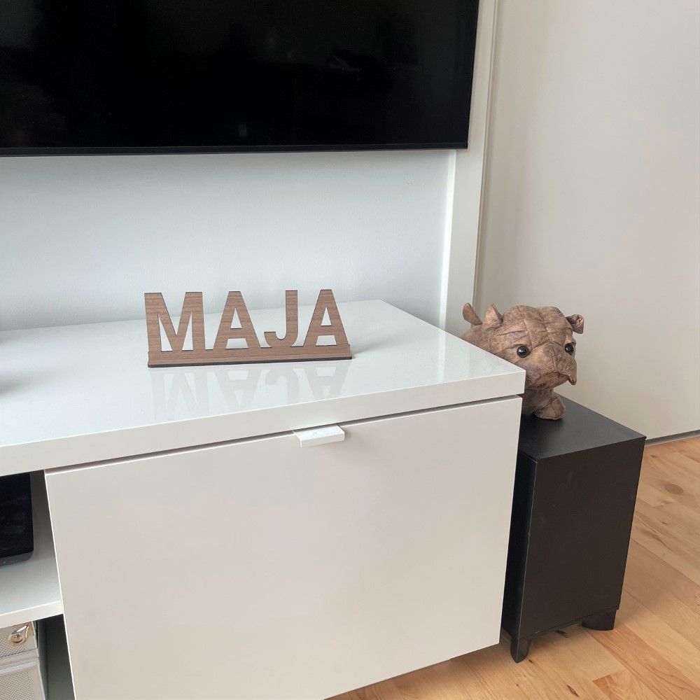 Dekorativt personligt navneskilt på fod, så det nemt kan placeres på hylden.