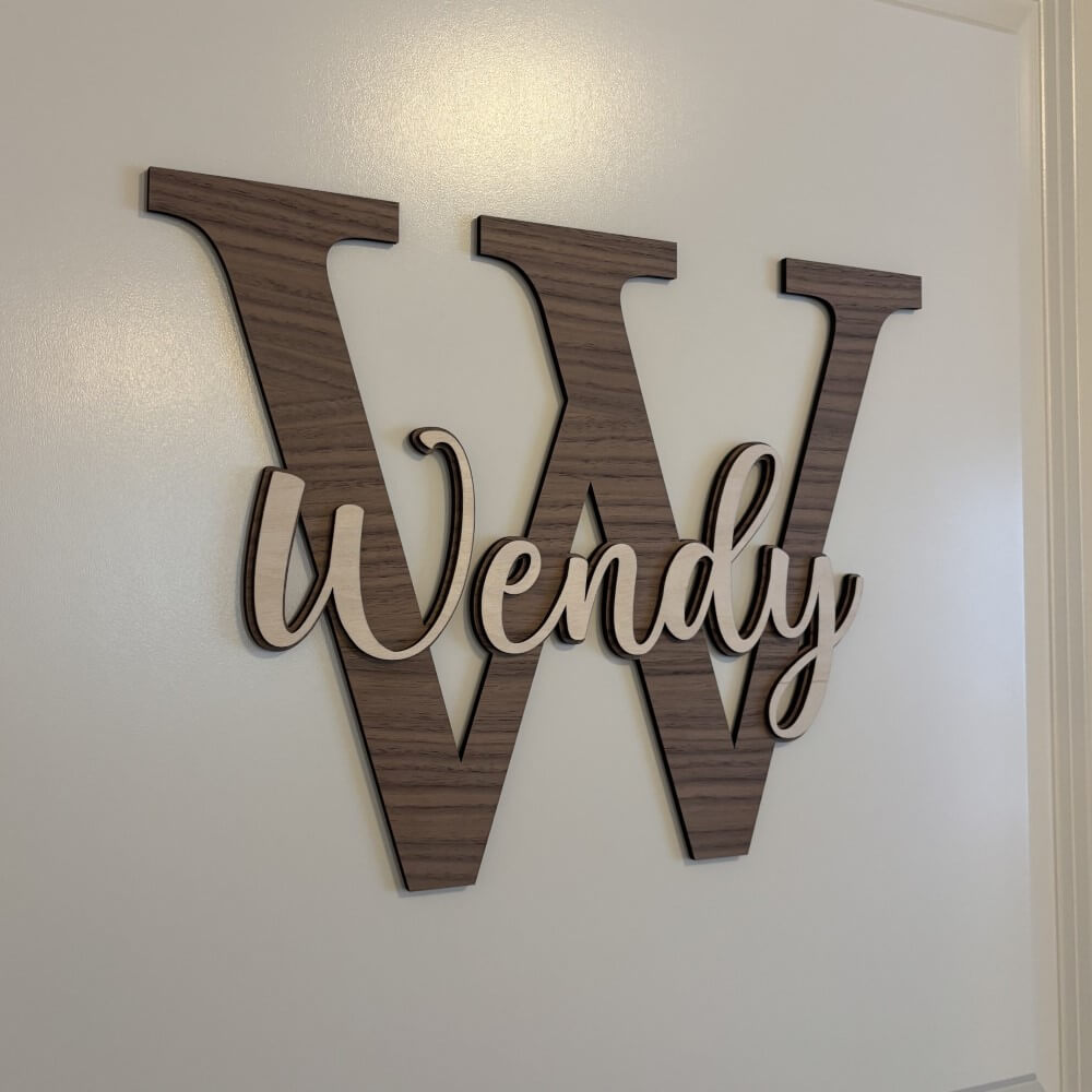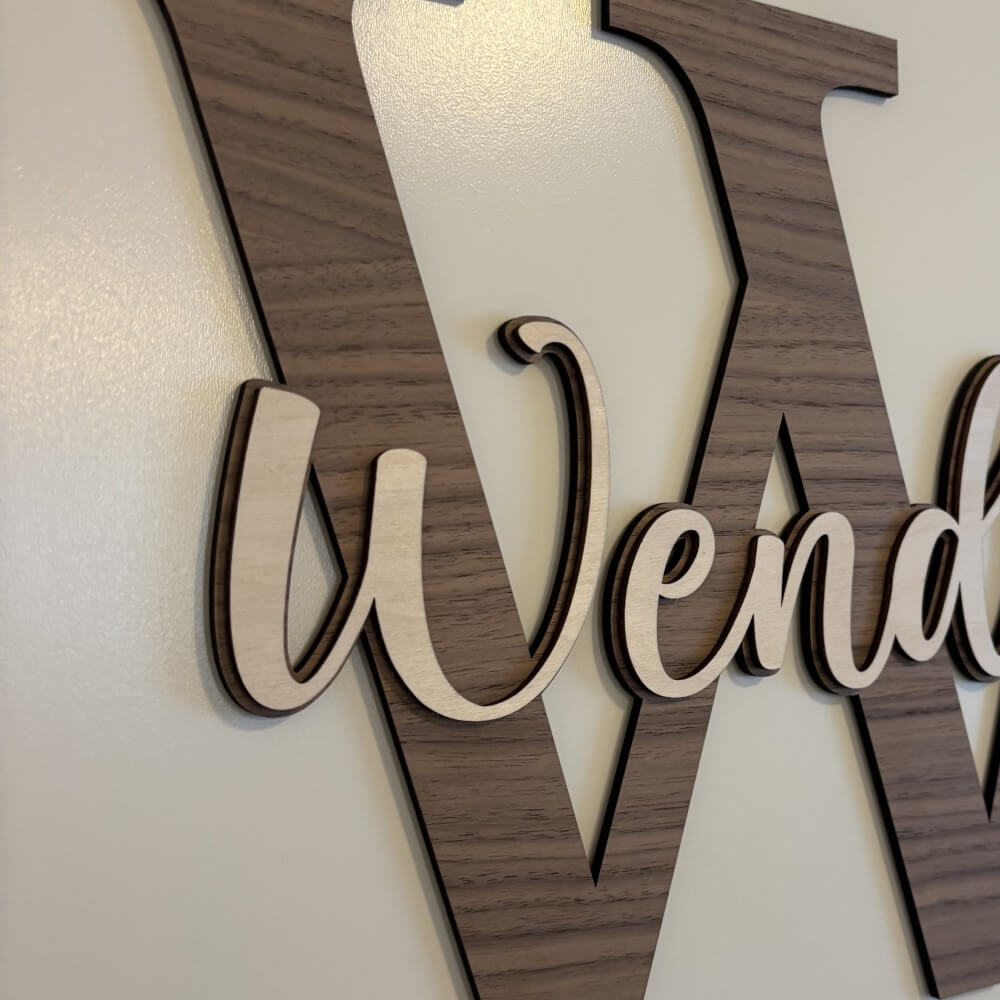 Navneskilt med hele navnet sat hen over det store forbogstav. Lige til at sætte op på døren, eller stille på en hylde på værelset. Flot og elegant design, som passer ind i ethvert hjem. Det store bogstav er lavet i valnød, og hele navnet i birk. Det giver en god kontrast med det lyse og det mørke.