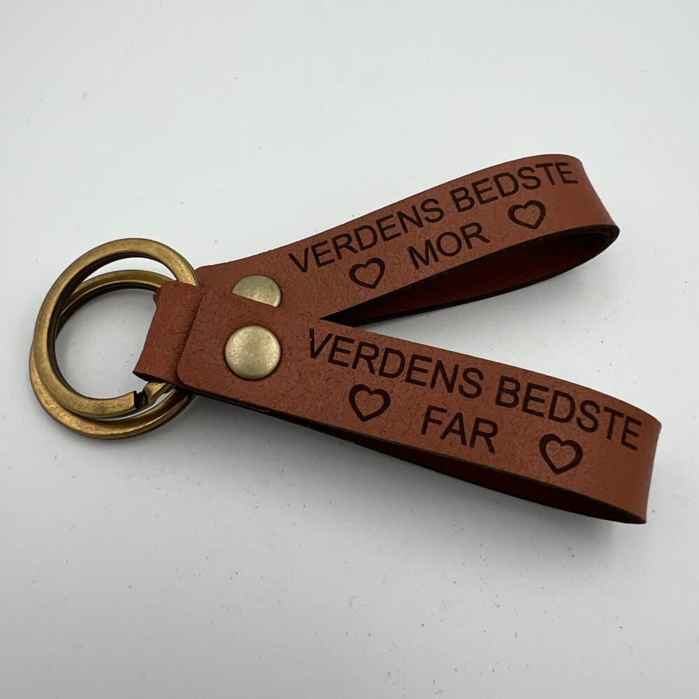 Personlig nøglering i cognac farvet læder, med nitte og nøglering i gammel messing. Vælg imellem flere forskellig tekster.