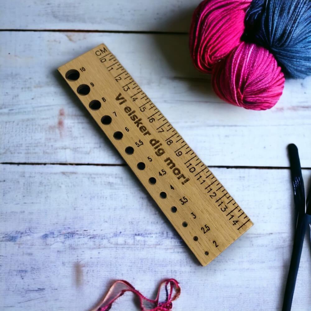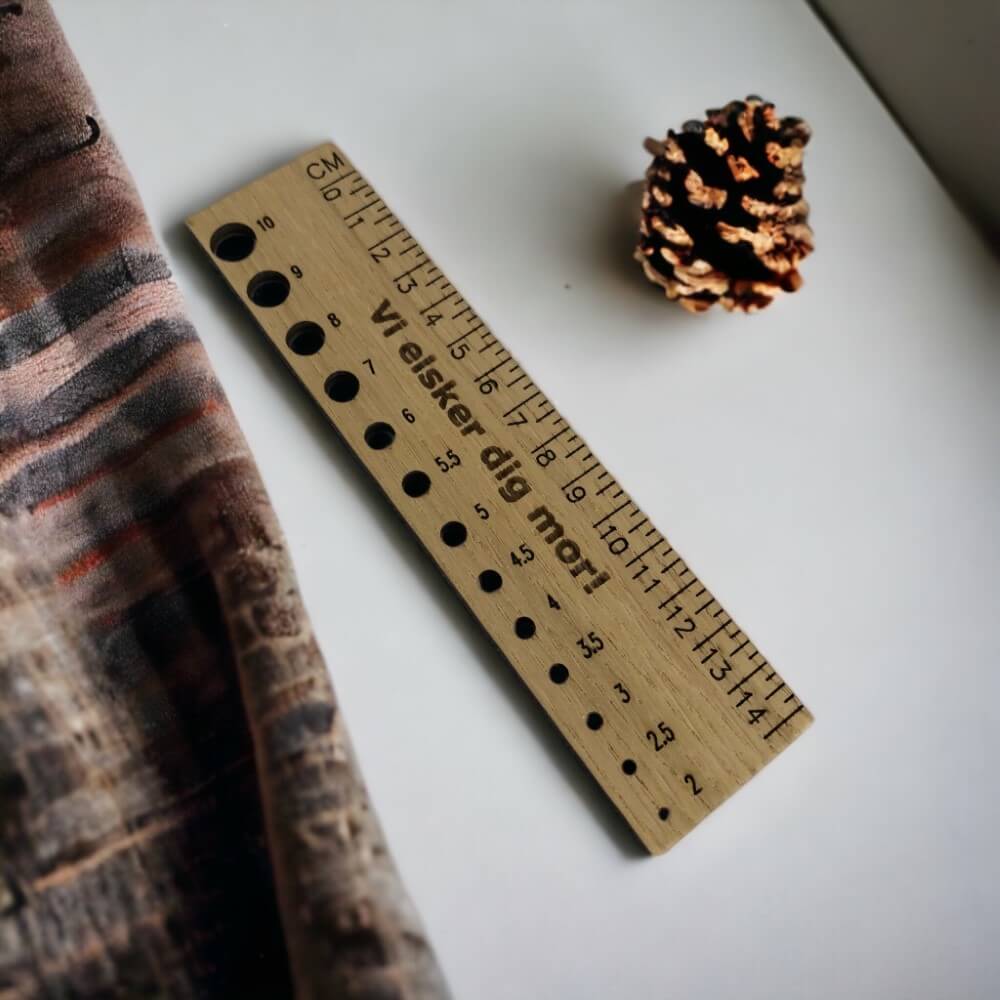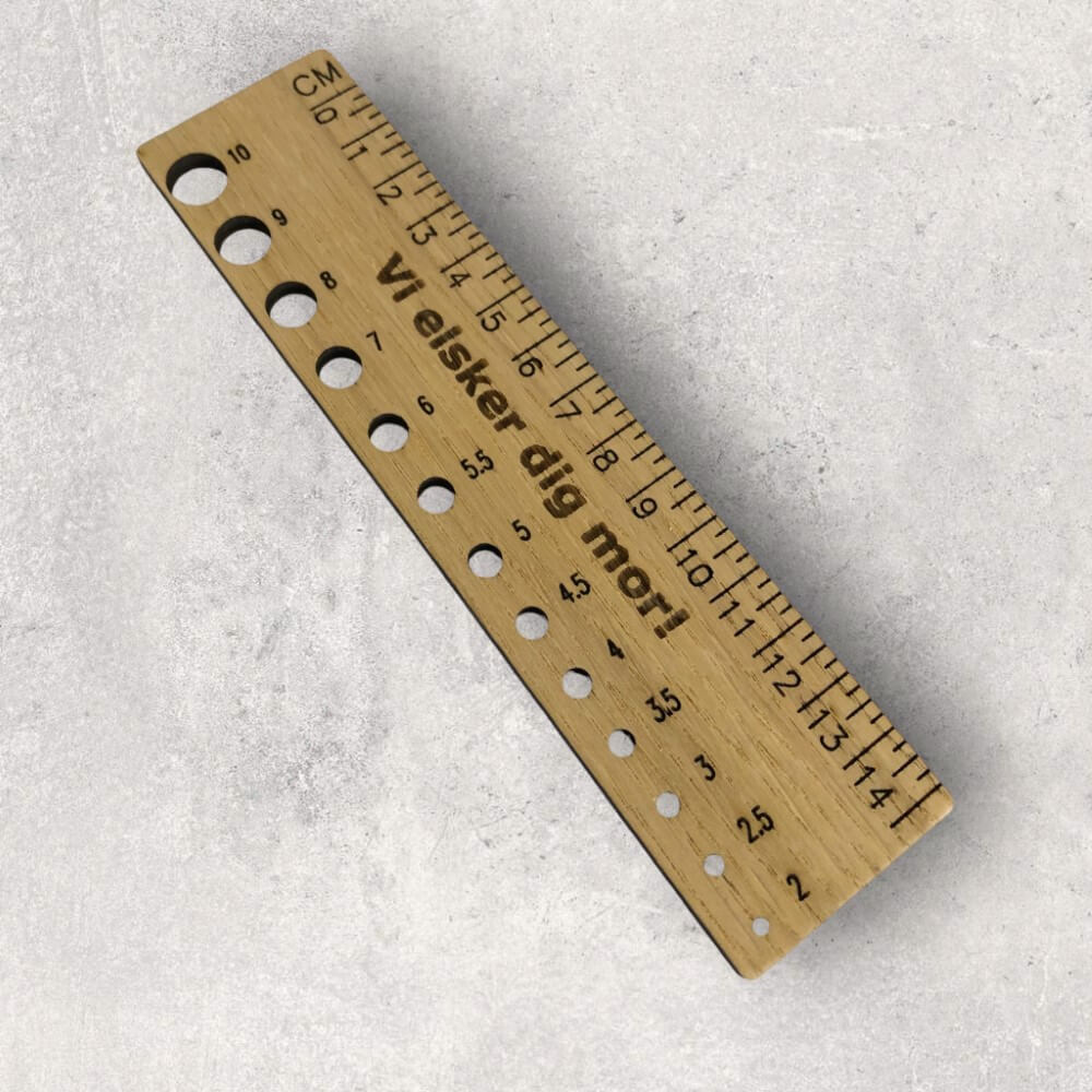 Fin strikkepindsmåler, som kan personliggøres med en valgfri tekst. Perfekt som en lille gave til den strikkeglade person.