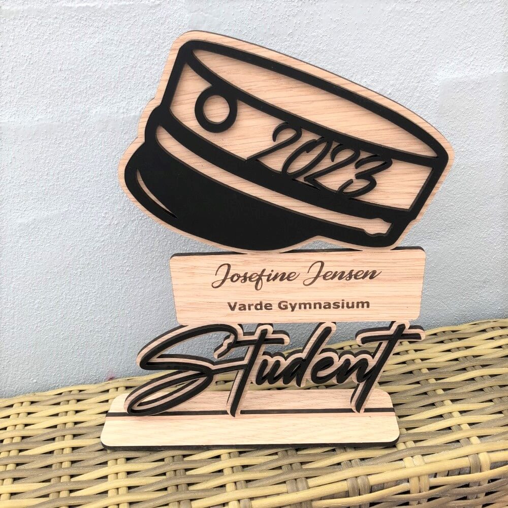 Flot træ skilt til den nyudklækket student. En fantastisk personlig gave til studenten. Et minde om det hårde slid, lange nætter med bøgerne, og en nervepirrende eksamensperiode er slut, og skal naturlig fejres og huskes med dette flotte skilt.